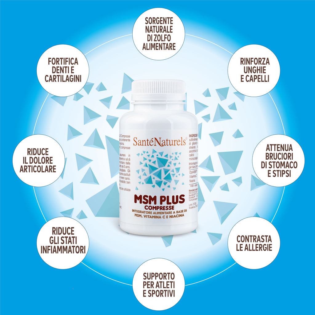 L'integratore alimentare MSM - Metilsulfonilmetano o "metil sulfonil metano" - è una sorgente naturale di Zolfo Organico. Lo Zolfo Organico è un componente essenziale delle cellule viventi e rappresenta il quarto elemento più abbondante nell'organismo umano in termini di peso, paragonabile al potassio e leggermente più abbondante rispetto a sodio e cloro.
